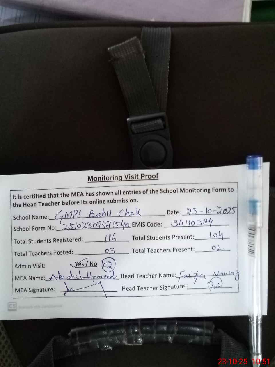 | Attendance Register | Head Teacher | MEA with School | Visit Proof |