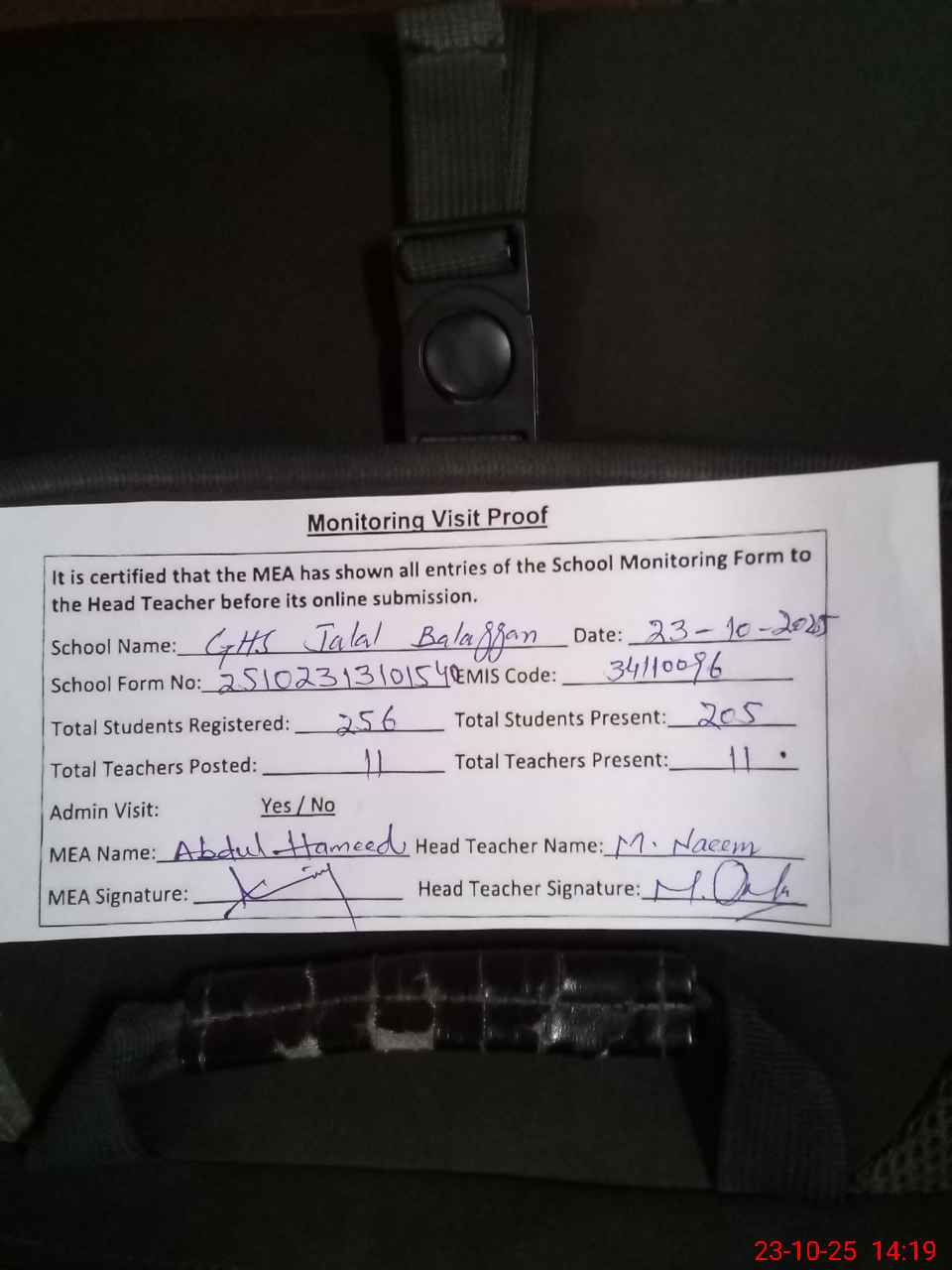 | EMIS Code: 34110096 | Name of School: GHS JALAL BALAGGAN | |||