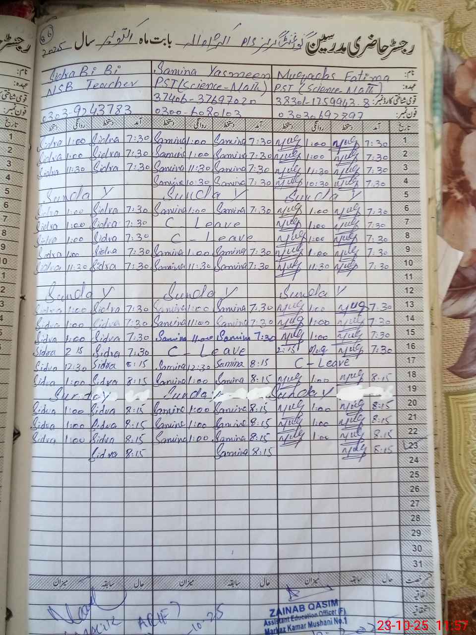| CNIC | Full Name | Designation | R/C | Absence During Last Calender Month |