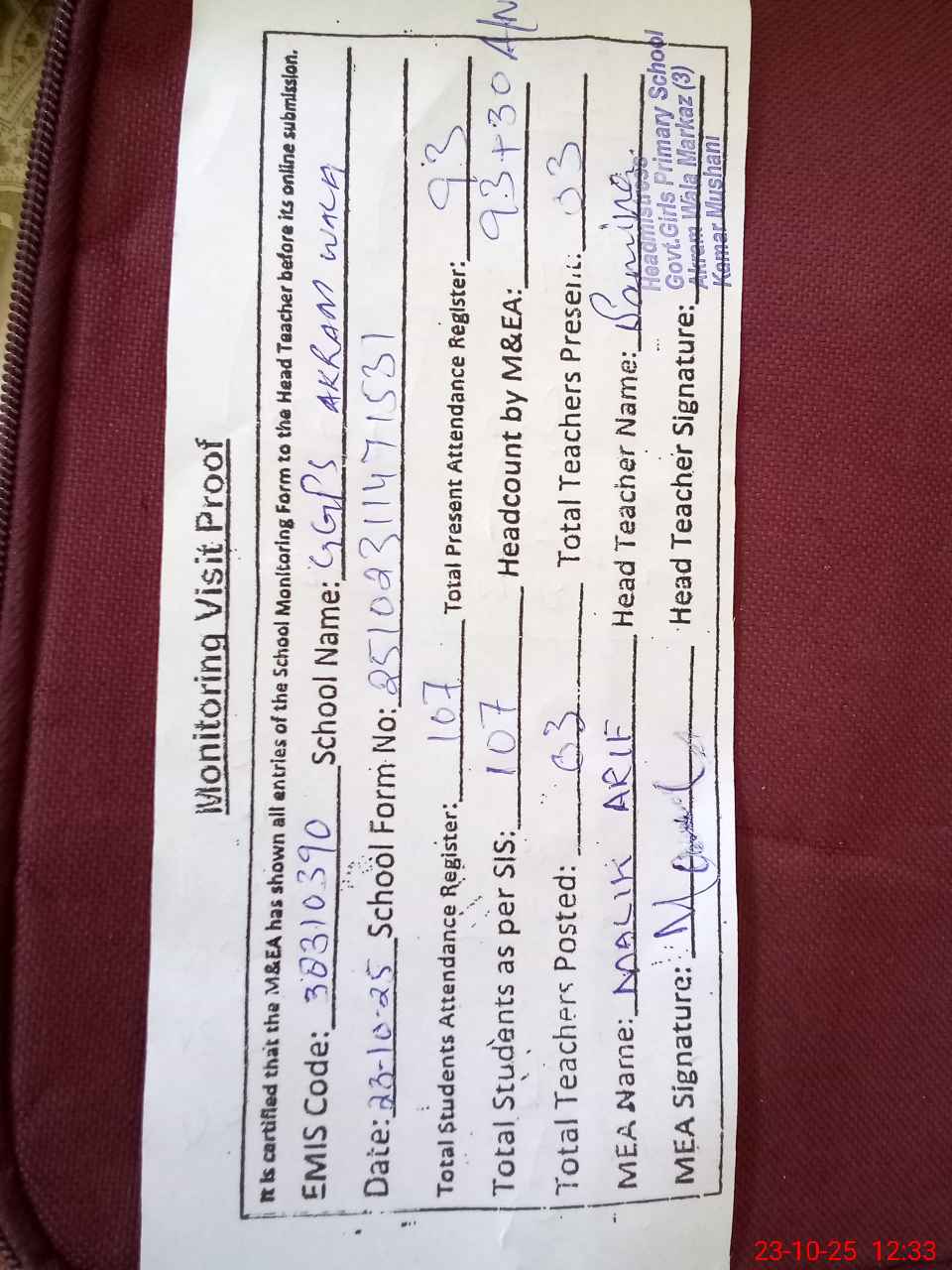 | Attendance Register | Head Teacher | MEA with School | Visit Proof |