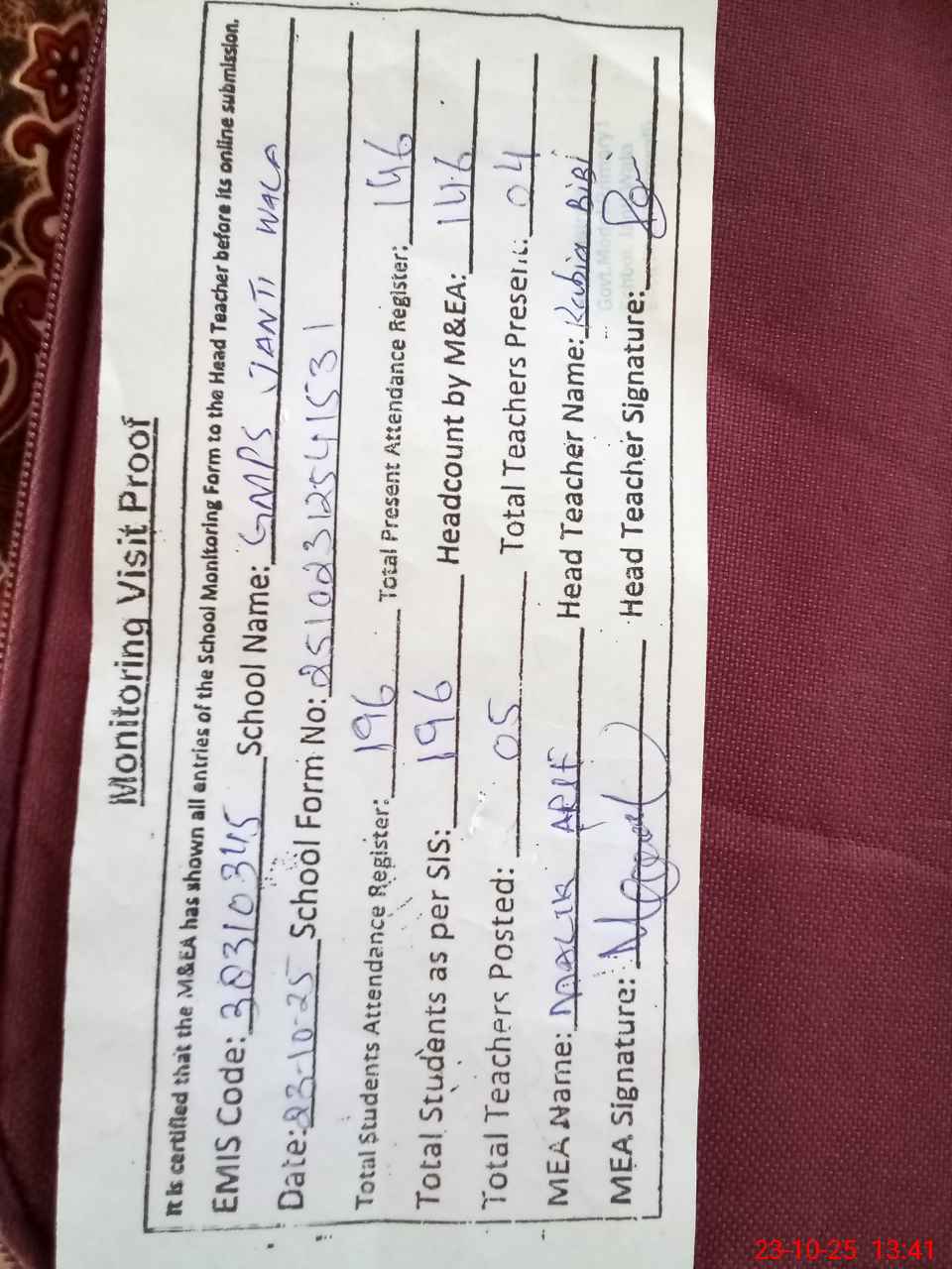 | Attendance Register | Head Teacher | MEA with School | Visit Proof |