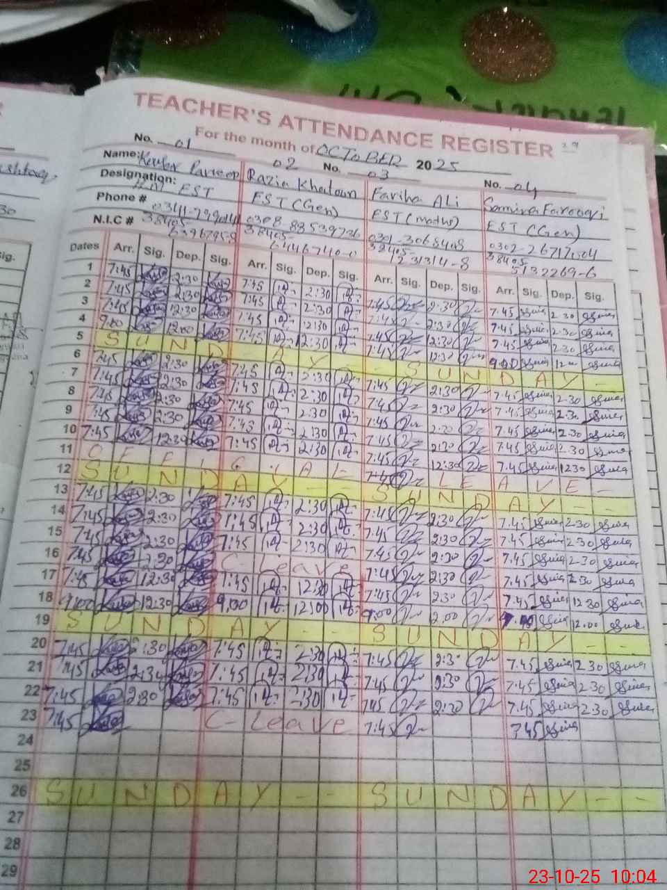 | CNIC | Full Name | Designation | R/C | Absence during last cal. month |