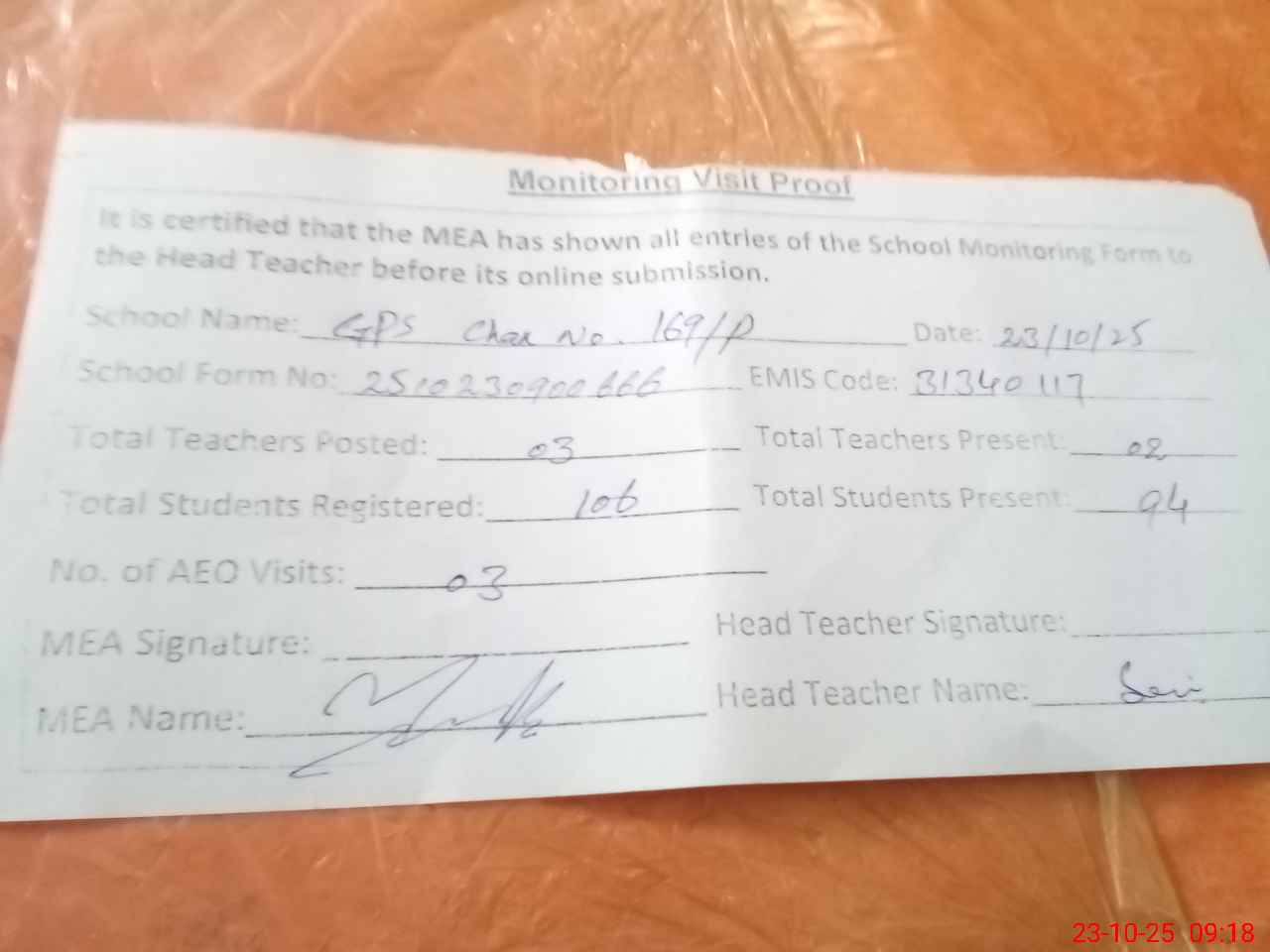 | Attendance Register | Head Teacher | MEA with School | Visit Proof |