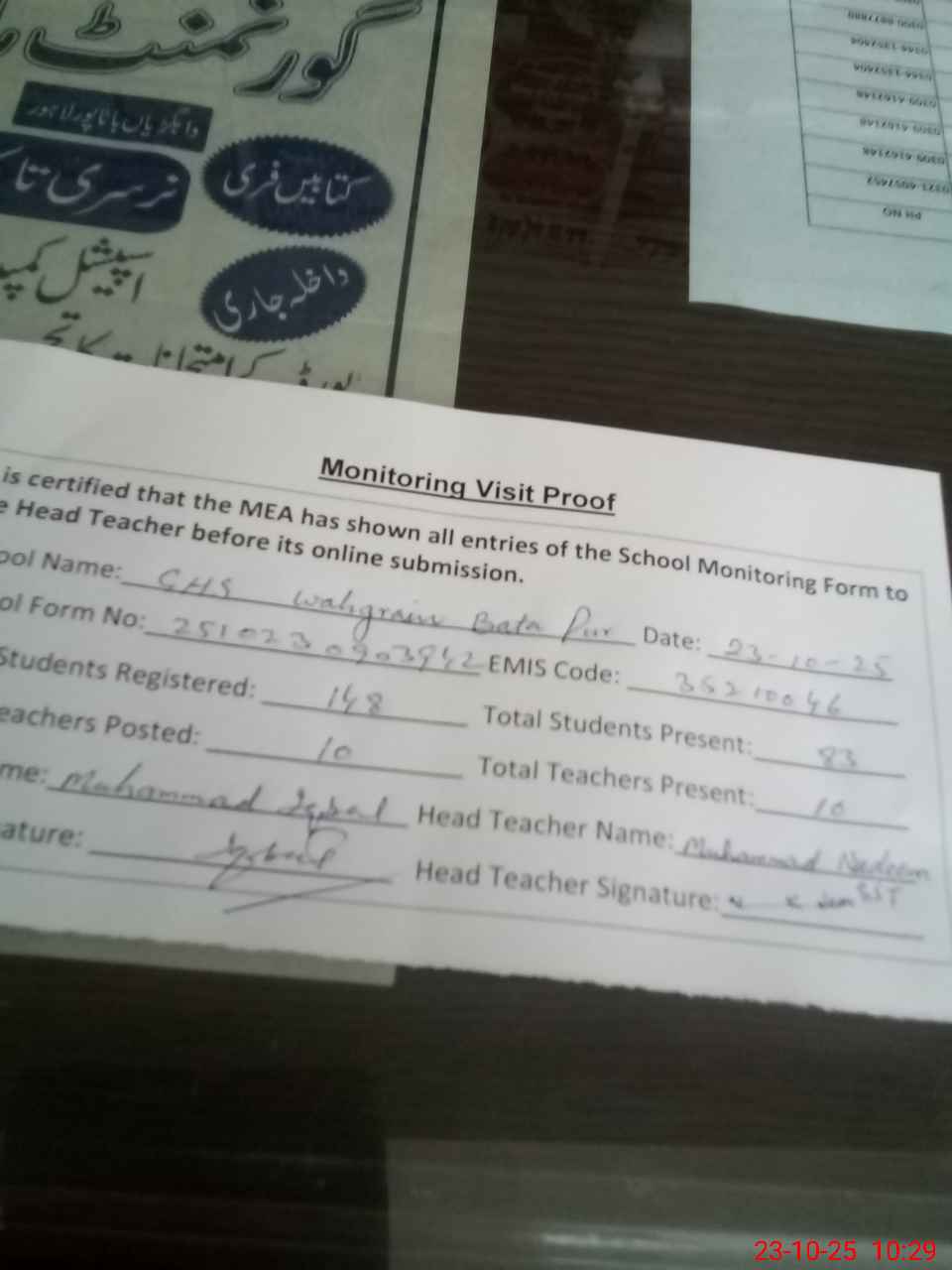 | EMIS Code: 35210046 | Name of School: GHS WAHGRAIN BATA PUR | |||