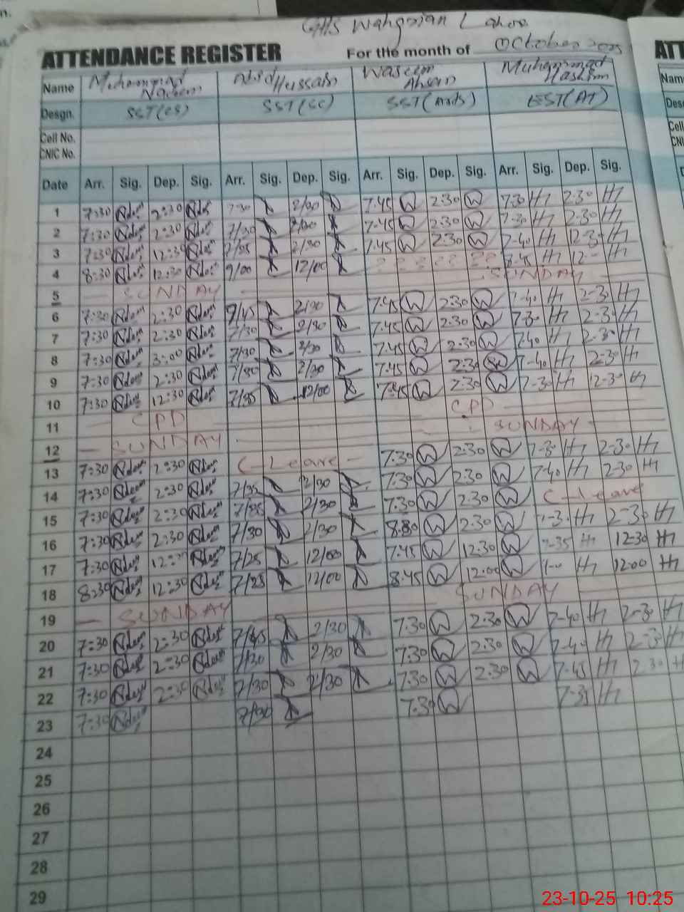 | CNIC | Full Name | Designation | R/C | Absence during last cal. month | Leave Type | Remarks for today (Leave,Training, Exam,Absent,Late, Other duty) | |||||||