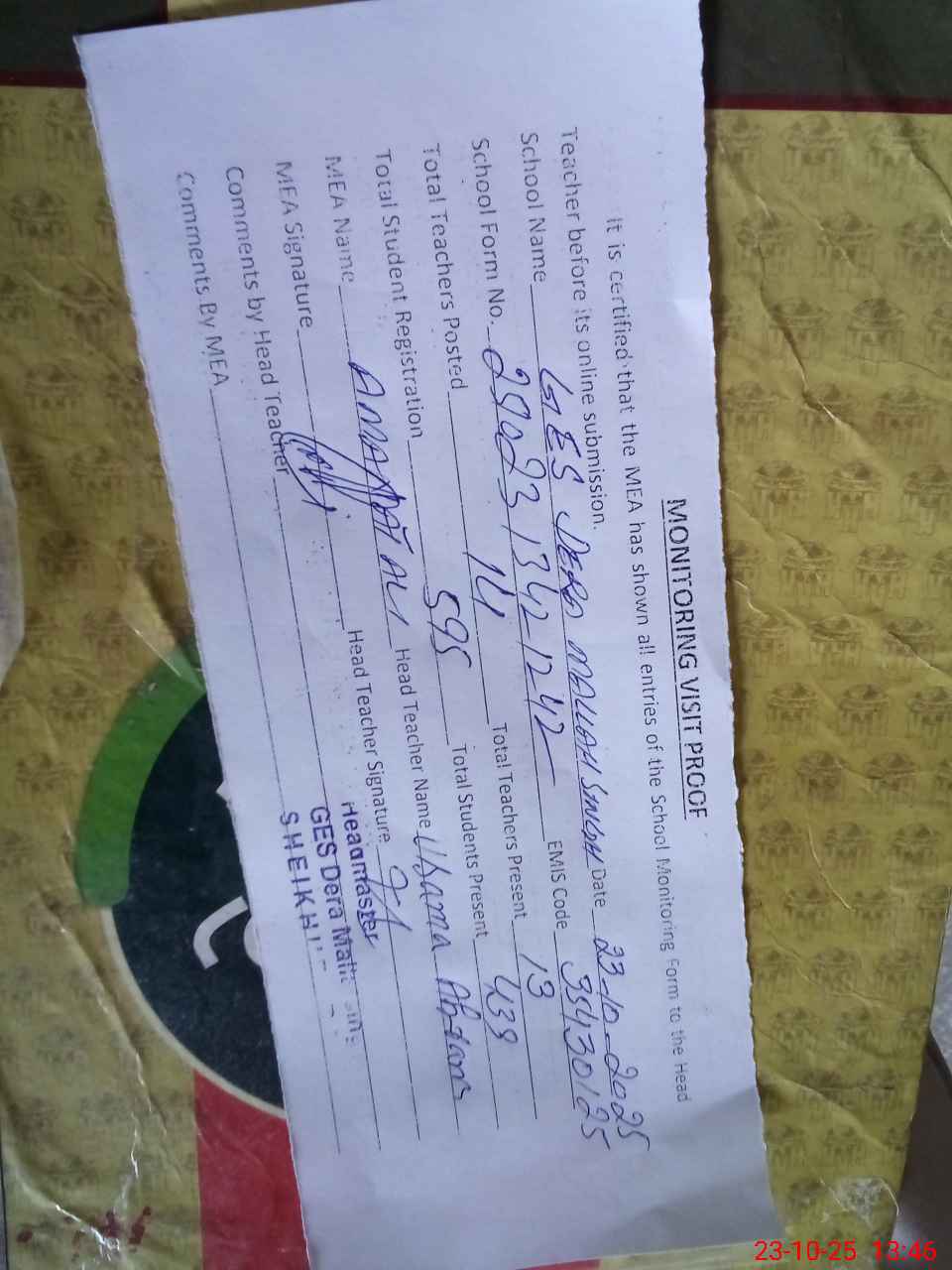 | Attendance Register | Head Teacher | MEA with School | Visit Proof |
