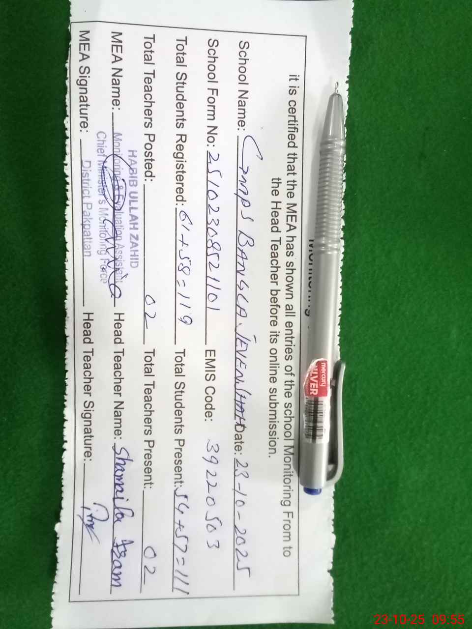 | Attendance Register | Head Teacher | MEA with School | Visit Proof |