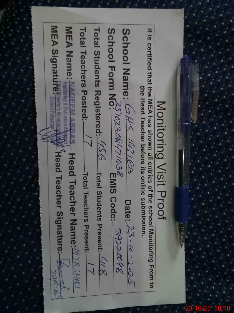 | Attendance Register | Head Teacher | MEA with School | Visit Proof |
