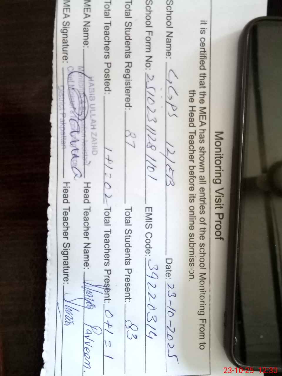 | Name: AM**** GH**** Designation: (School Headmaster's/Headmistress's) PST Phone/Cell Number: 03**** |