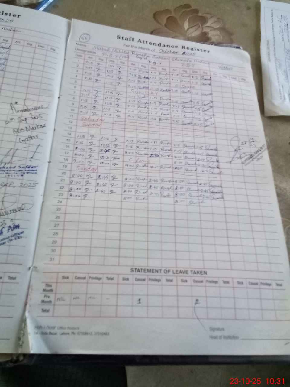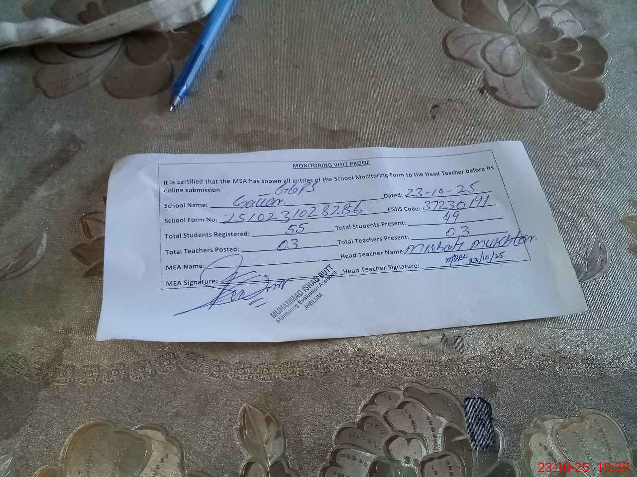 | Attendance Register | Head Teacher | MEA with School | Visit Proof |