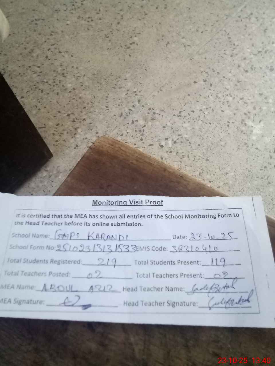 | Attendance Register | Head Teacher | MEA with School | Visit Proof |