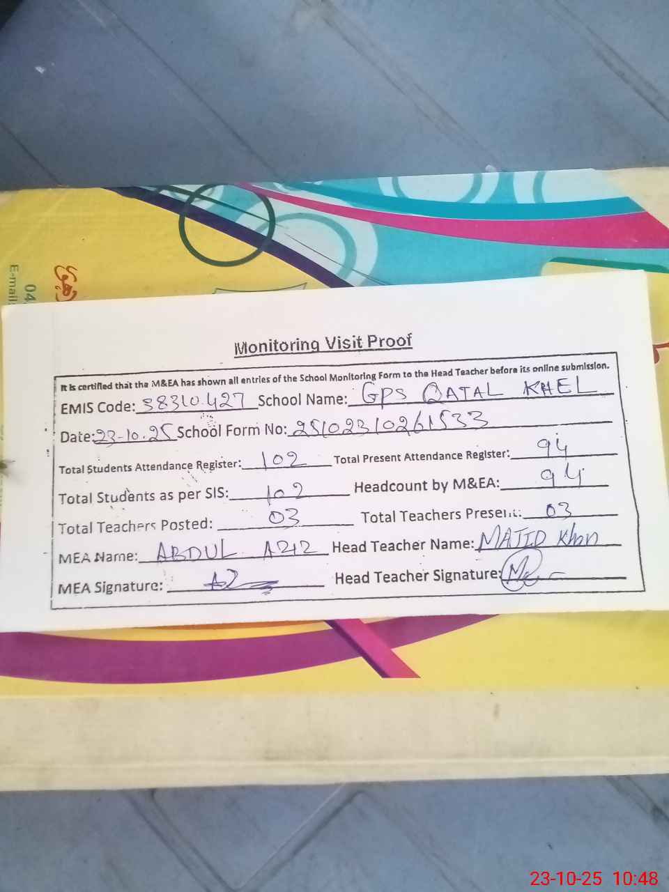 | Attendance Register | Head Teacher | MEA with School | Visit Proof |
