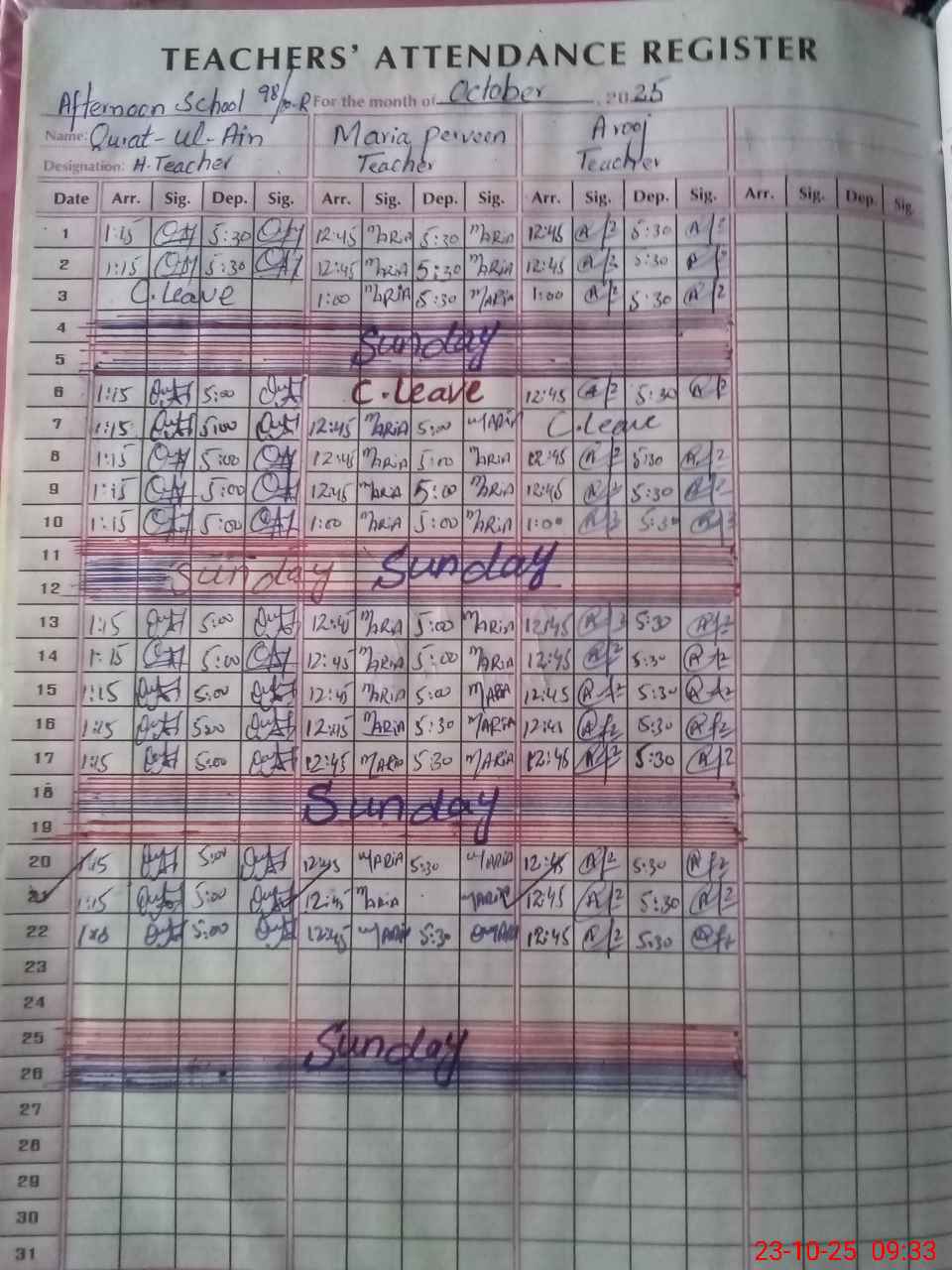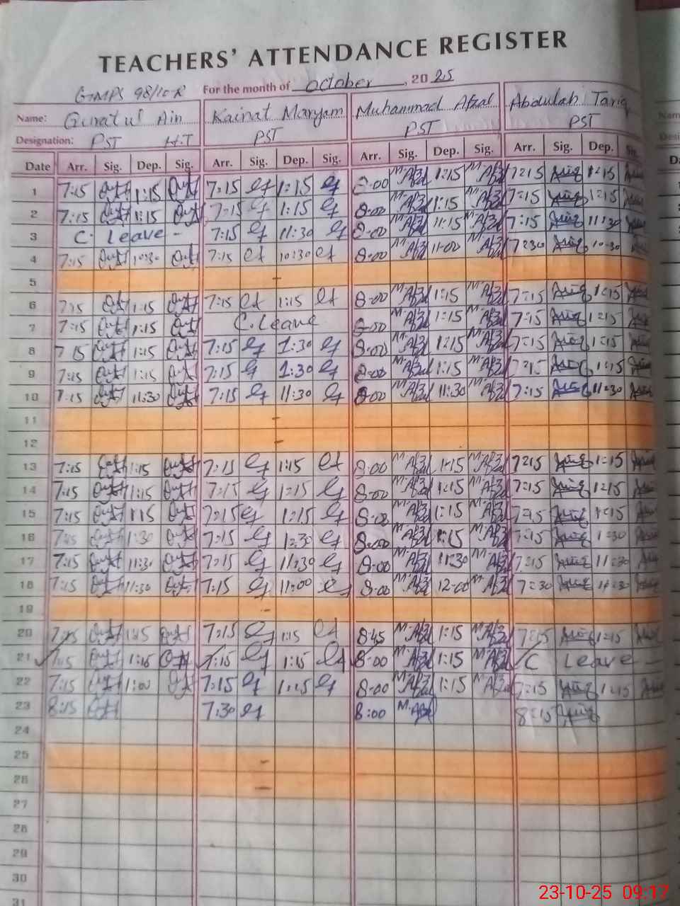 | CNIC | Full Name | Designation | R/C | Absence During Last Calender Month |