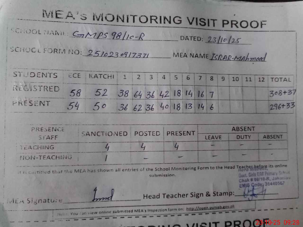 | Attendance Register | Head Teacher | MEA with School | Visit Proof |
