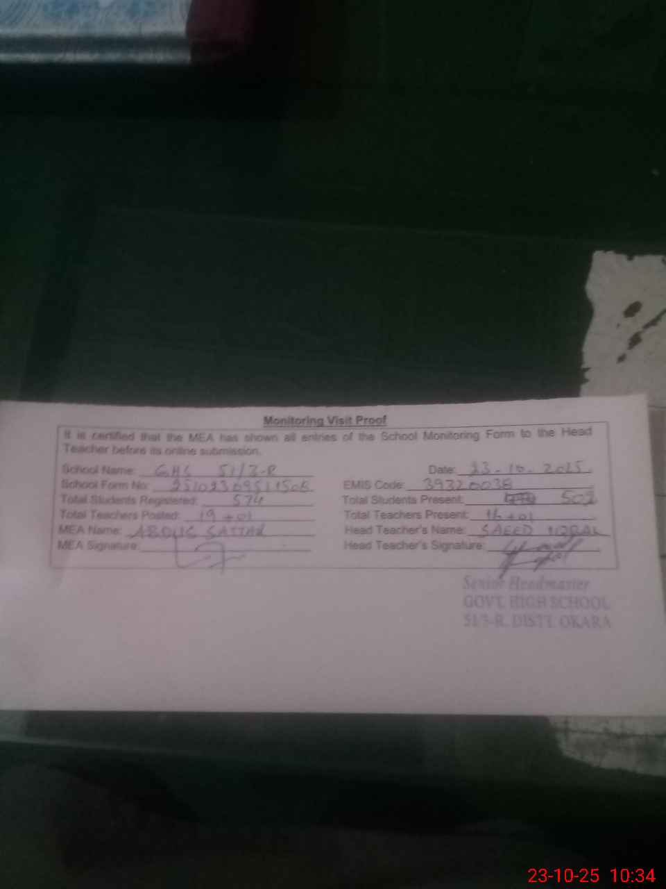 | Certified that this School was Inspected by the Undersigned MEA/DMO Today and the Information Stated Above is as Per Record. | |||||