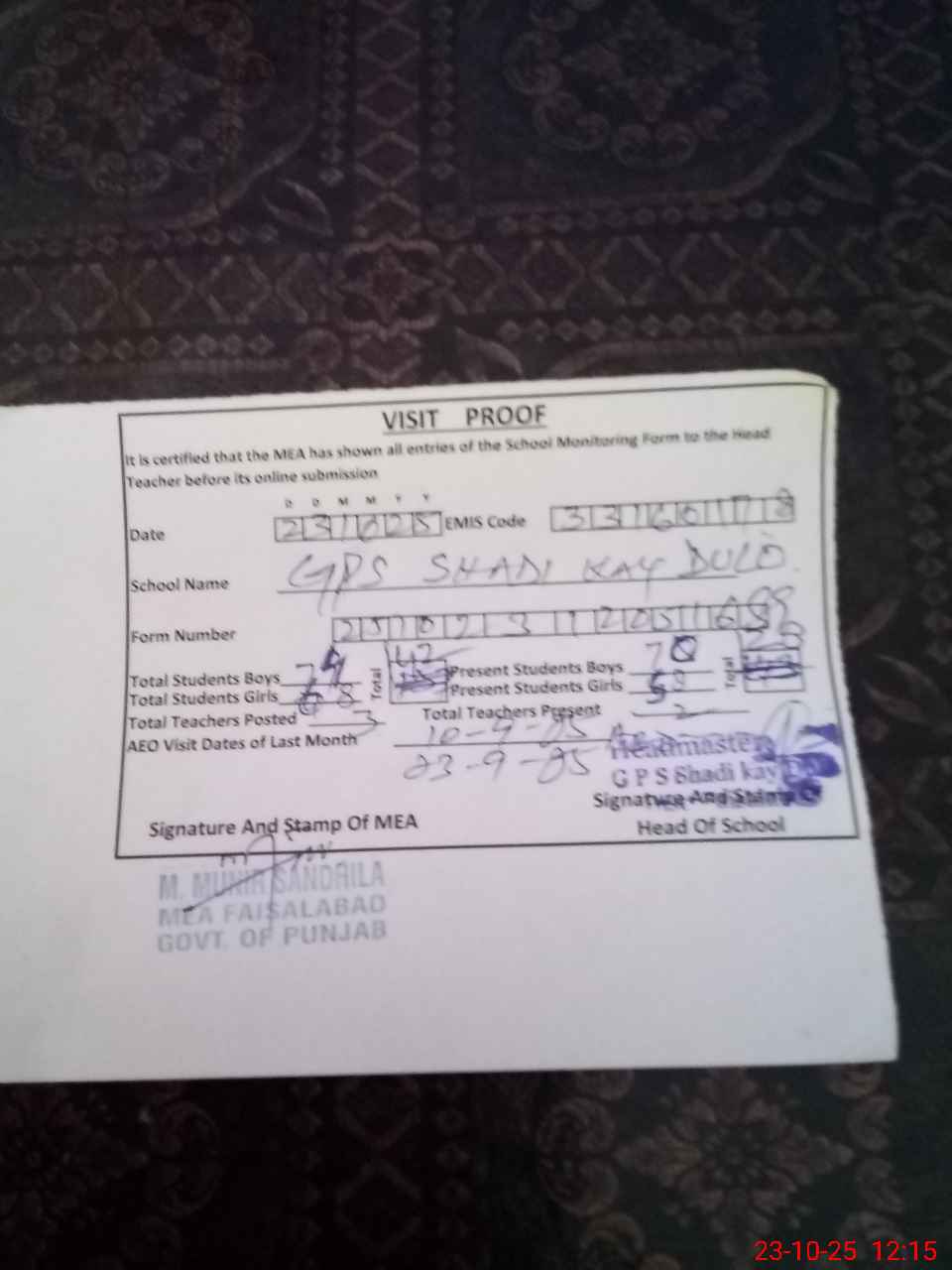 | Certified that this School was Inspected by the Undersigned MEA/DMO Today and the Information Stated Above is as Per Record. | |||||