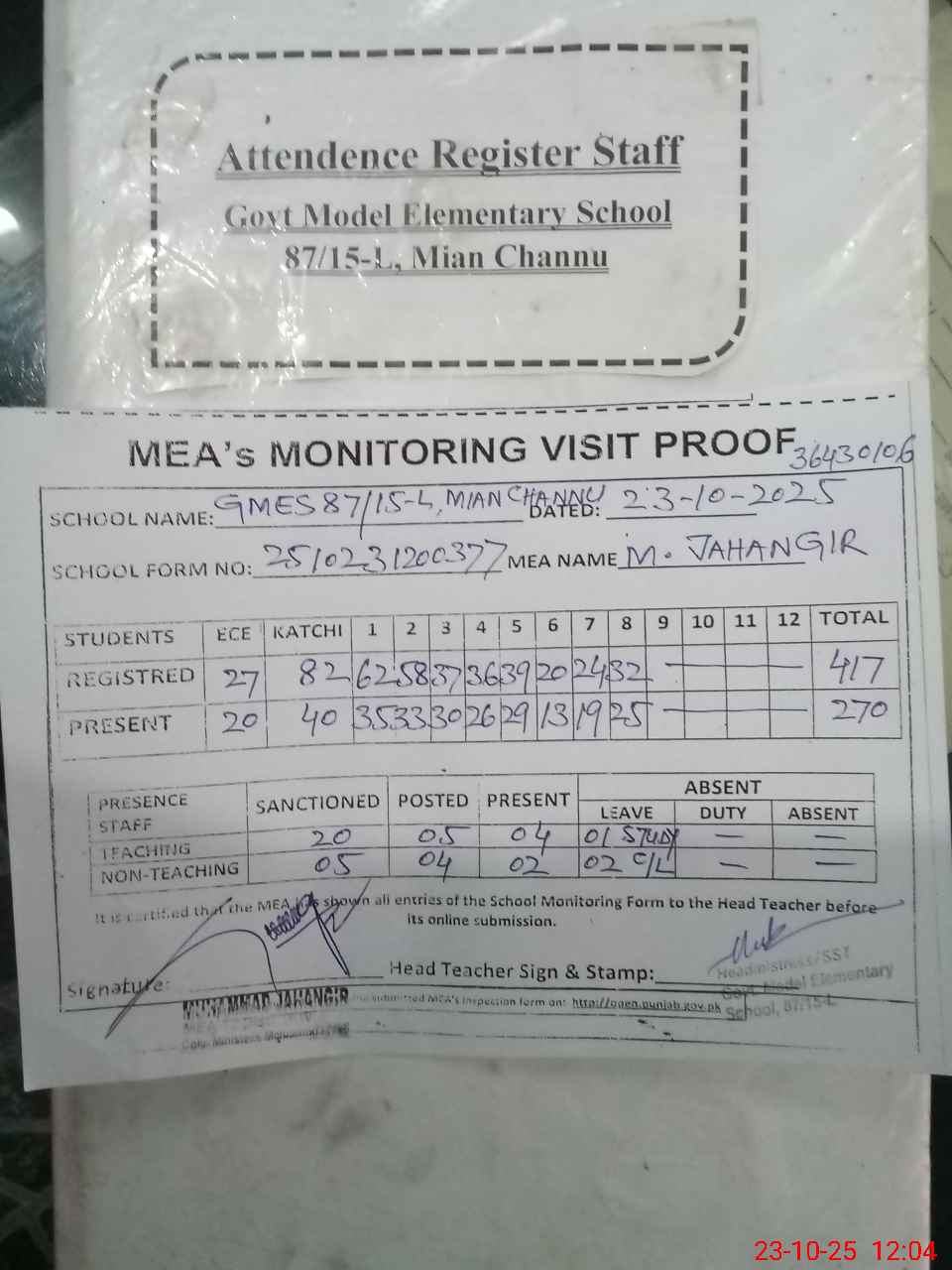| Attendance Register | Head Teacher | MEA with School | Visit Proof |