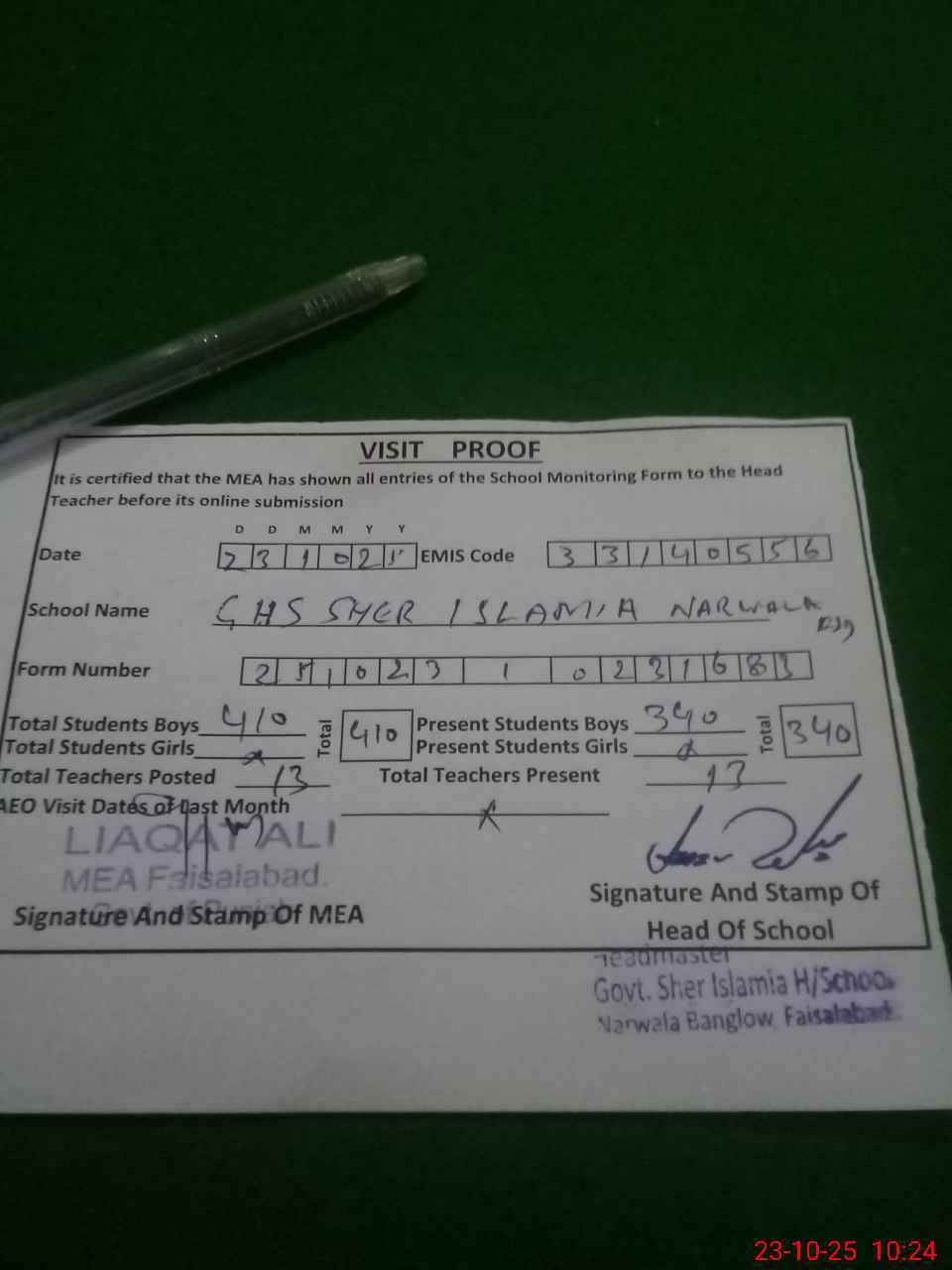 | Attendance Register | Head Teacher | MEA with School | Visit Proof |