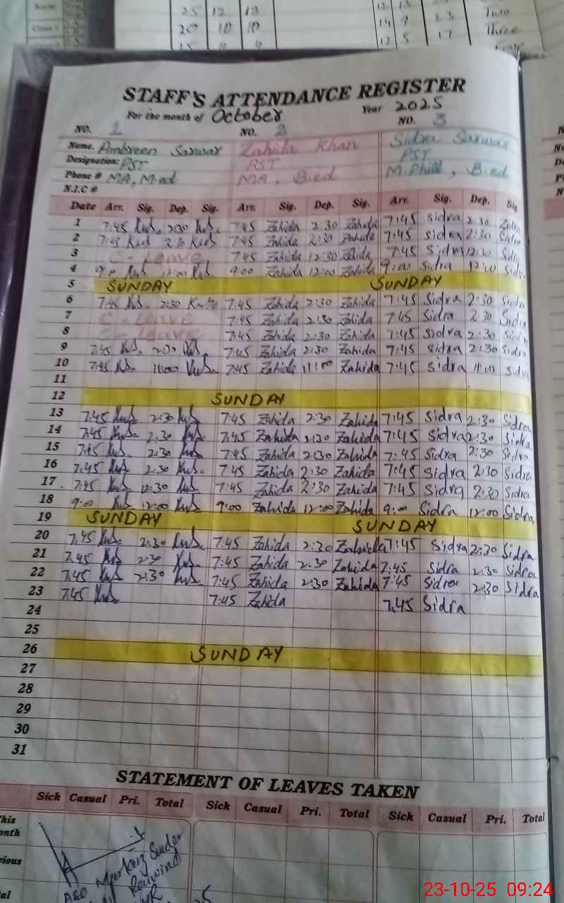 | Name: Am**** Sa**** Designation: (School Headmaster's/Headmistress's) Incharge Headmistress Phone/Cell Number: 03**** |