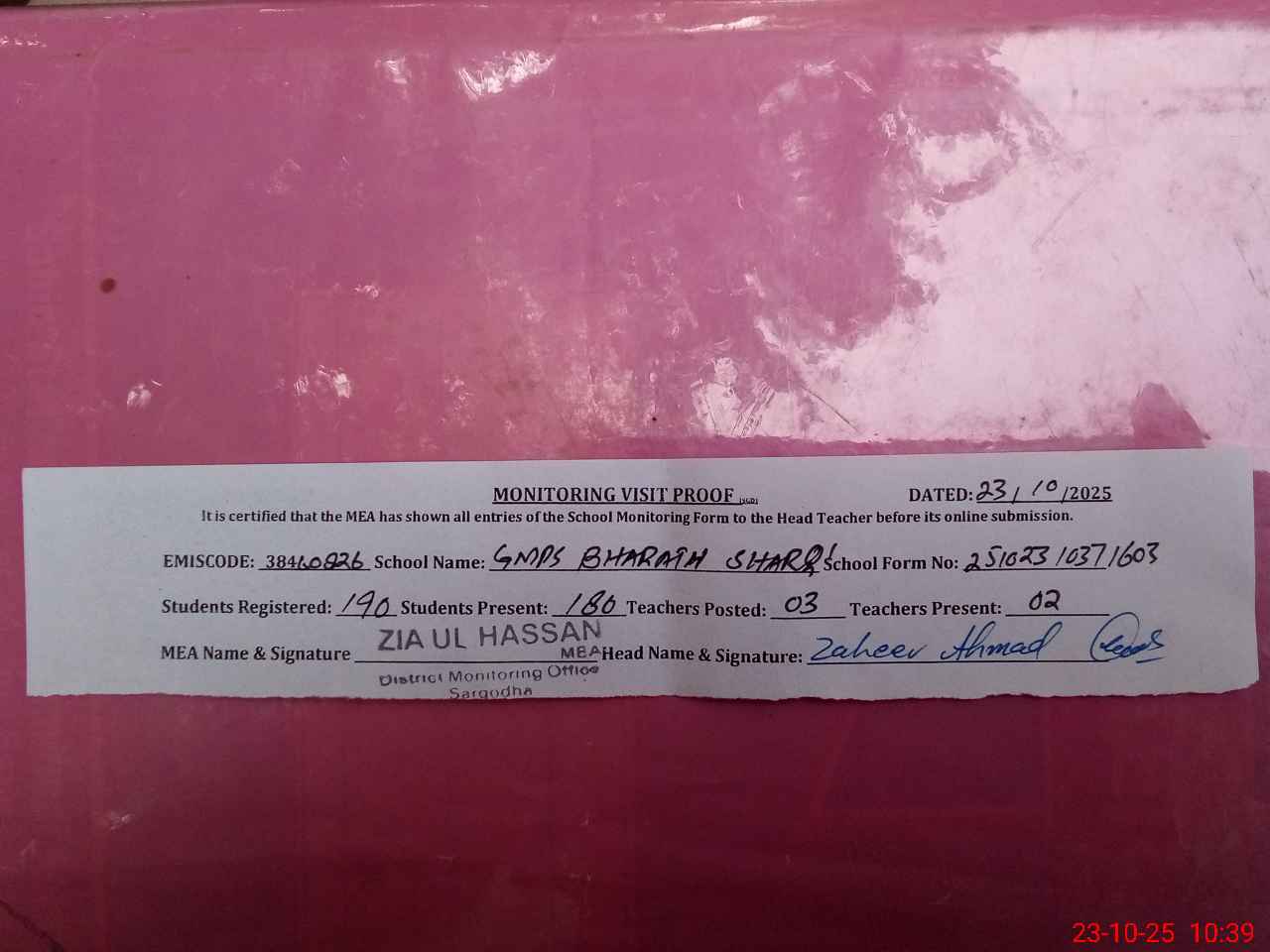 | Certified that this School was Inspected by the Undersigned MEA/DMO Today and the Information Stated Above is as Per Record. | |||||