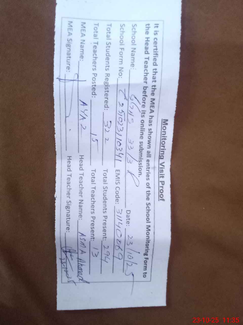 | Attendance Register | Head Teacher | MEA with School | Visit Proof |