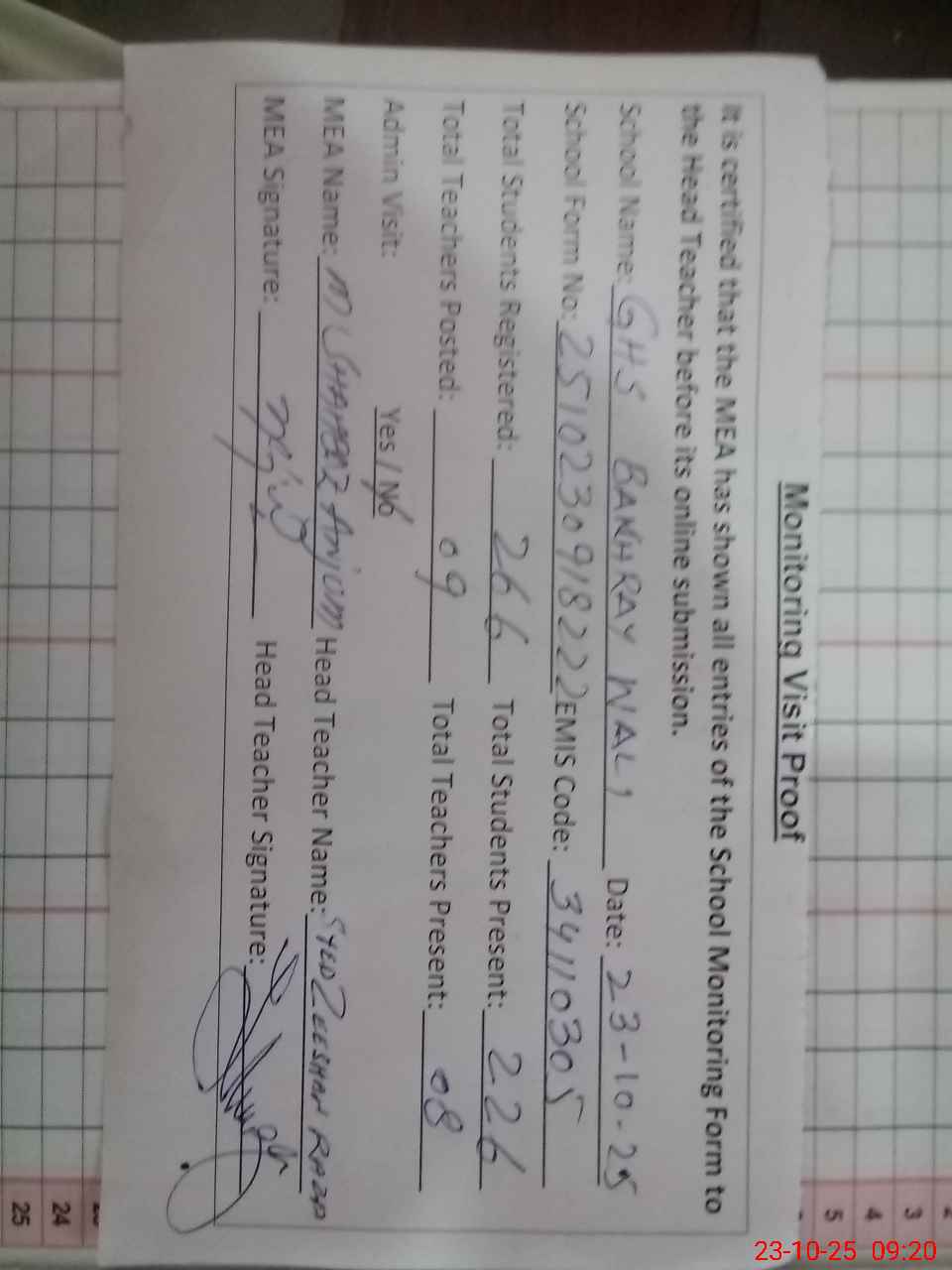 | Attendance Register | Head Teacher | MEA with School | Visit Proof |