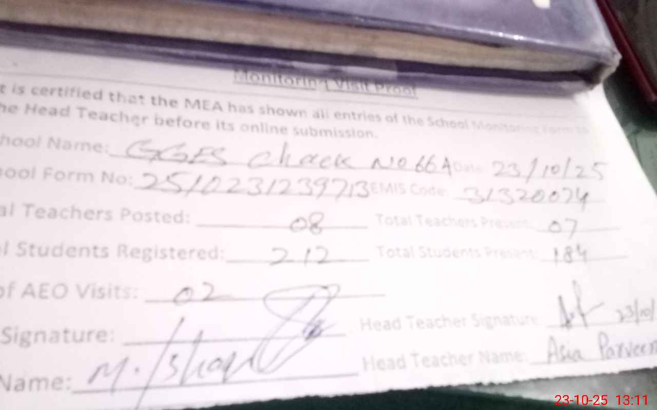 | Certified that this School was Inspected by the Undersigned MEA/DMO Today and the Information Stated Above is as Per Record. | |||||