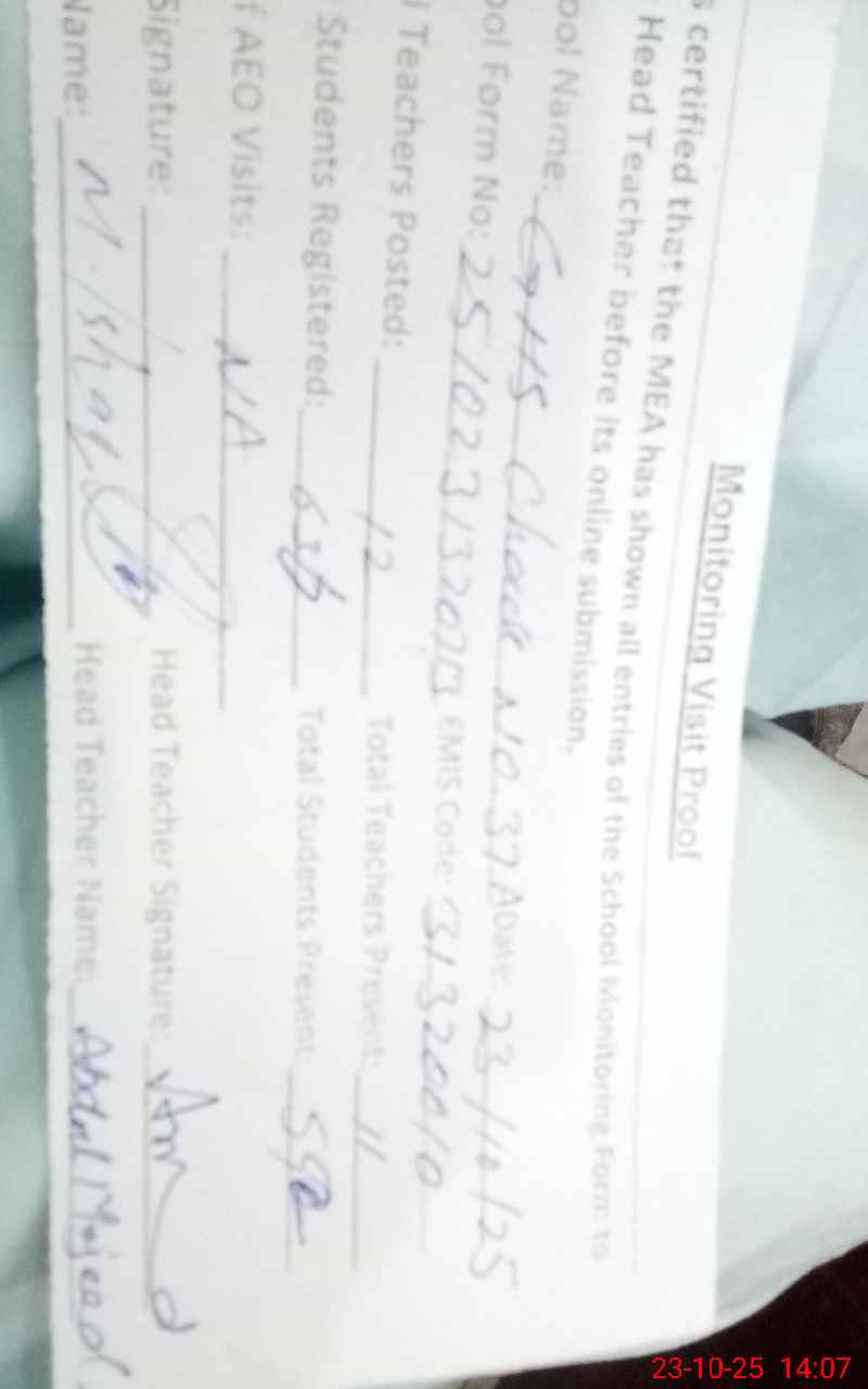 | EMIS Code: 31320010 | Name of School: GHS CHAK NO.37/A | |||