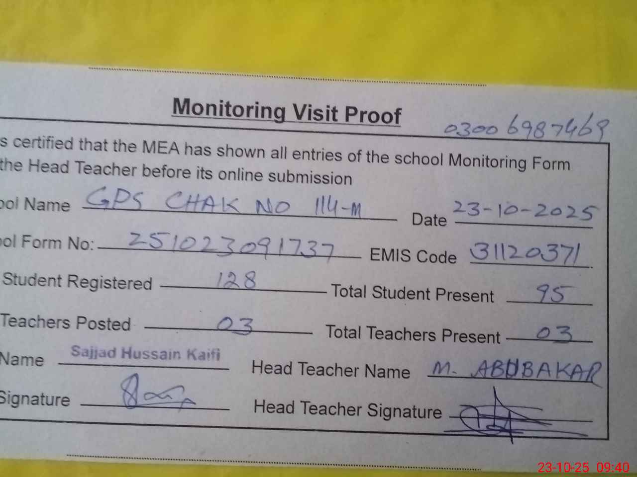 | EMIS Code: 31120371 | Name of School: GPS CHAK NO. 114 M | |||