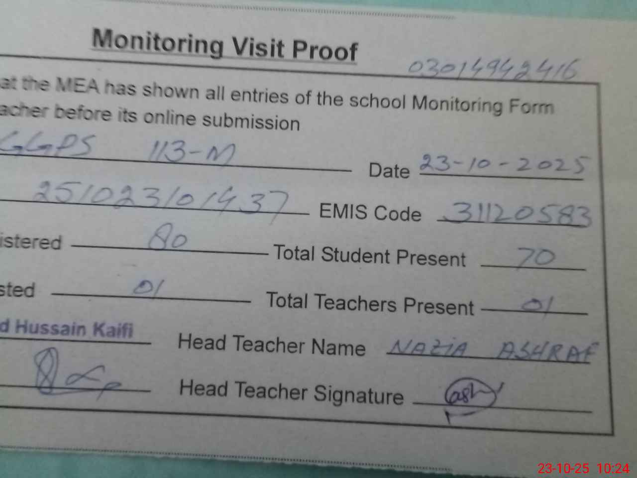 | Attendance Register | Head Teacher | MEA with School | Visit Proof |