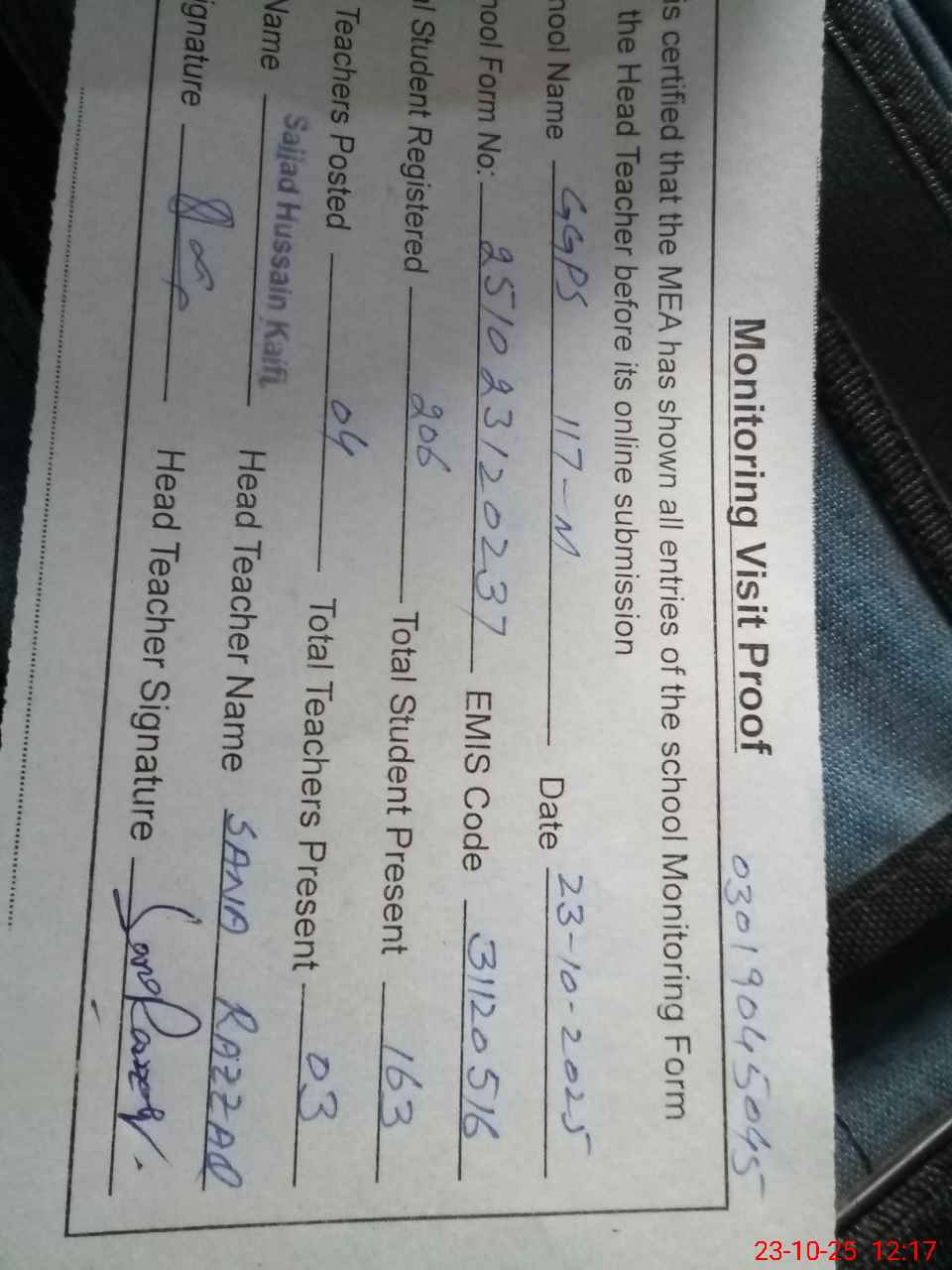 | Name: Sa**** Ra**** Designation: (School Headmaster's/Headmistress's) Pst Phone/Cell Number: 03**** |