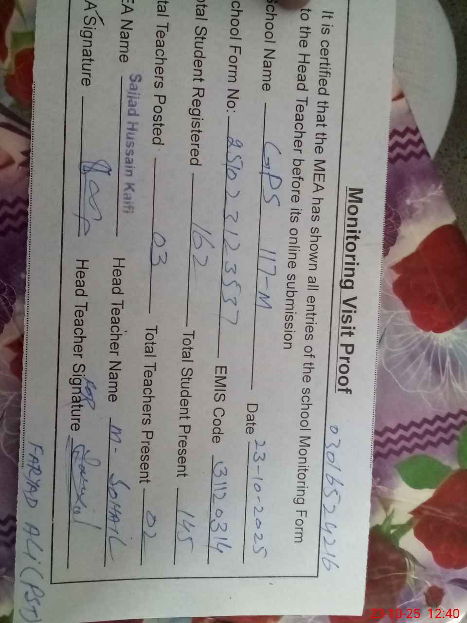 | Attendance Register | Head Teacher | MEA with School | Visit Proof |