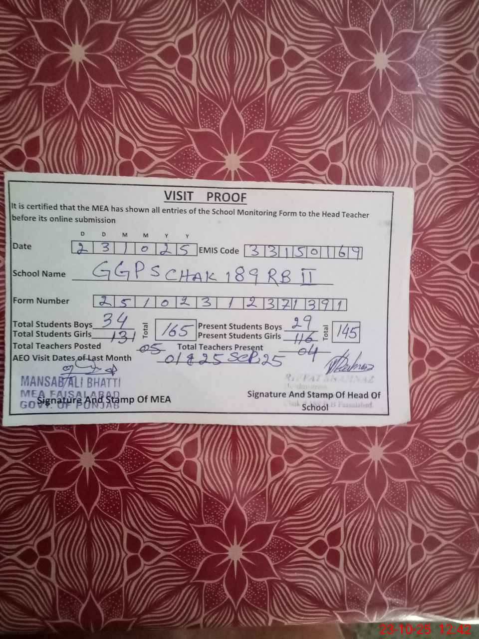 | Attendance Register | Head Teacher | MEA with School | Visit Proof |