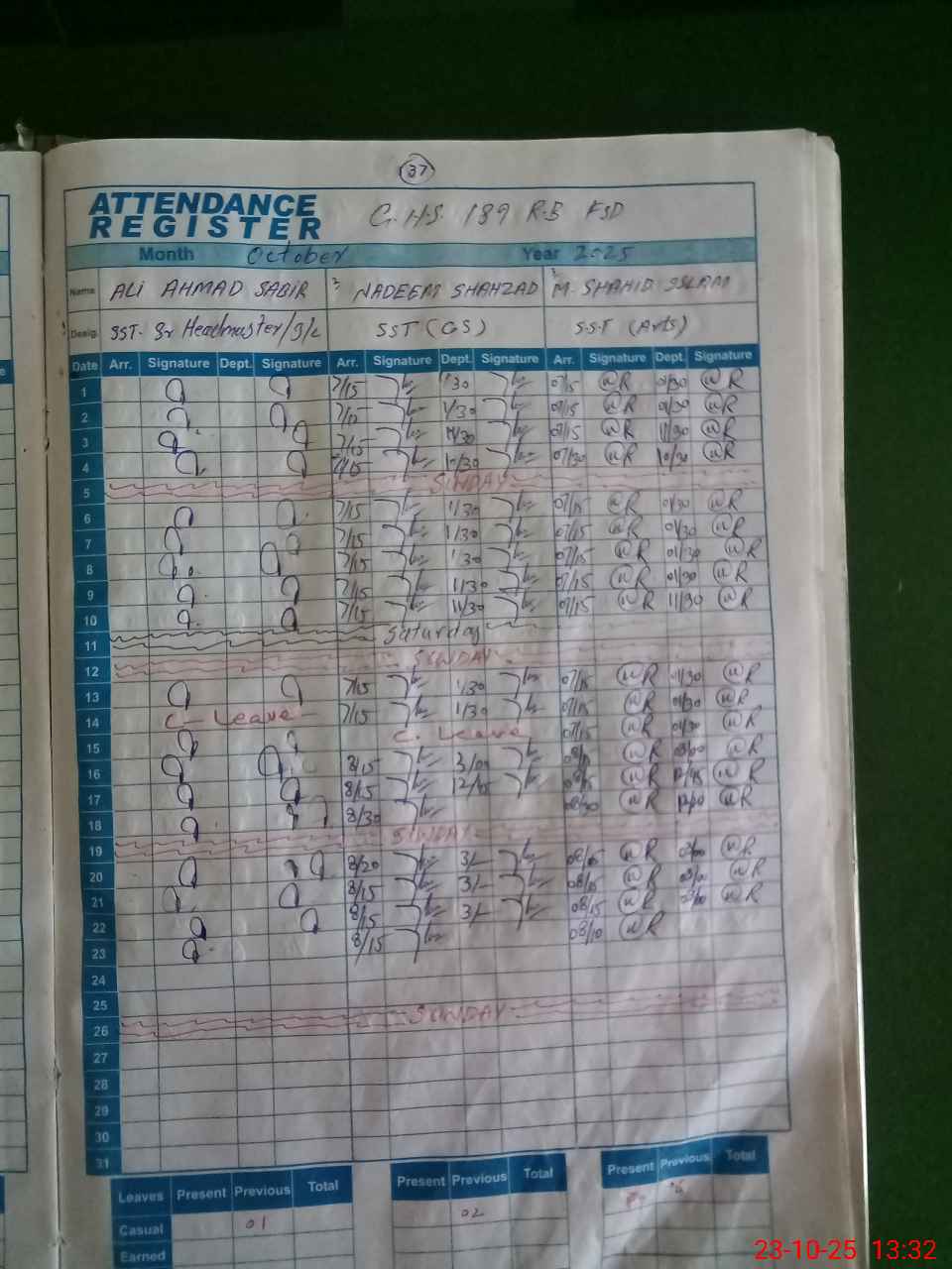 | CNIC | Full Name | Designation | R/C | Absence during last cal. month |