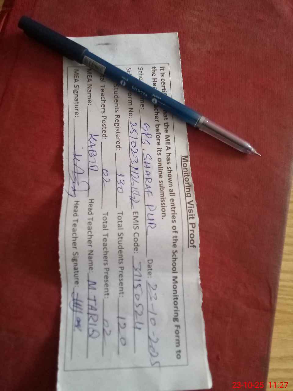 | Attendance Register | Head Teacher | MEA with School | Visit Proof |