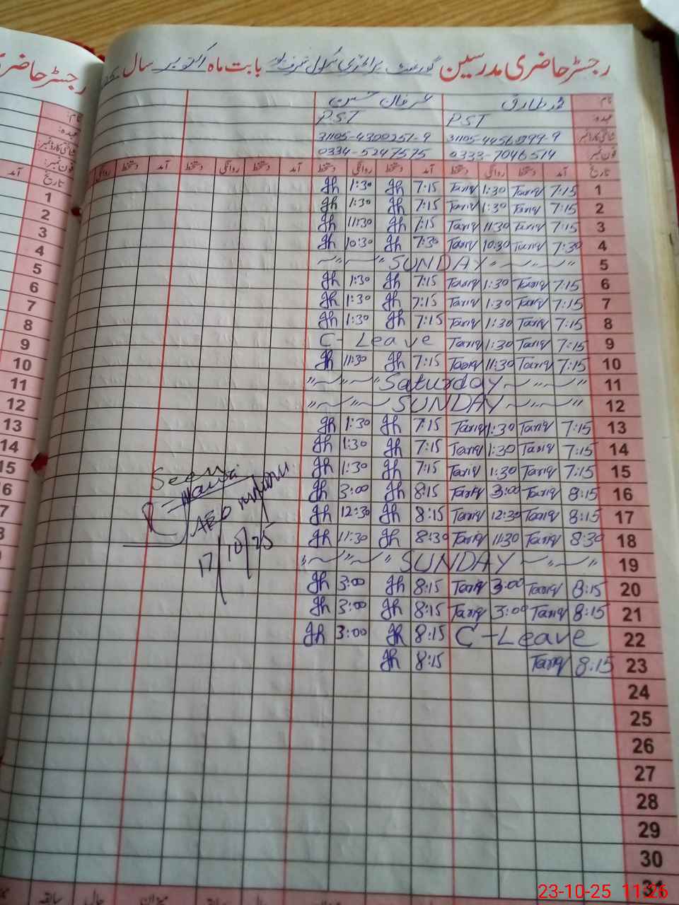 | CNIC | Full Name | Designation | R/C | Absence During Last Calender Month |