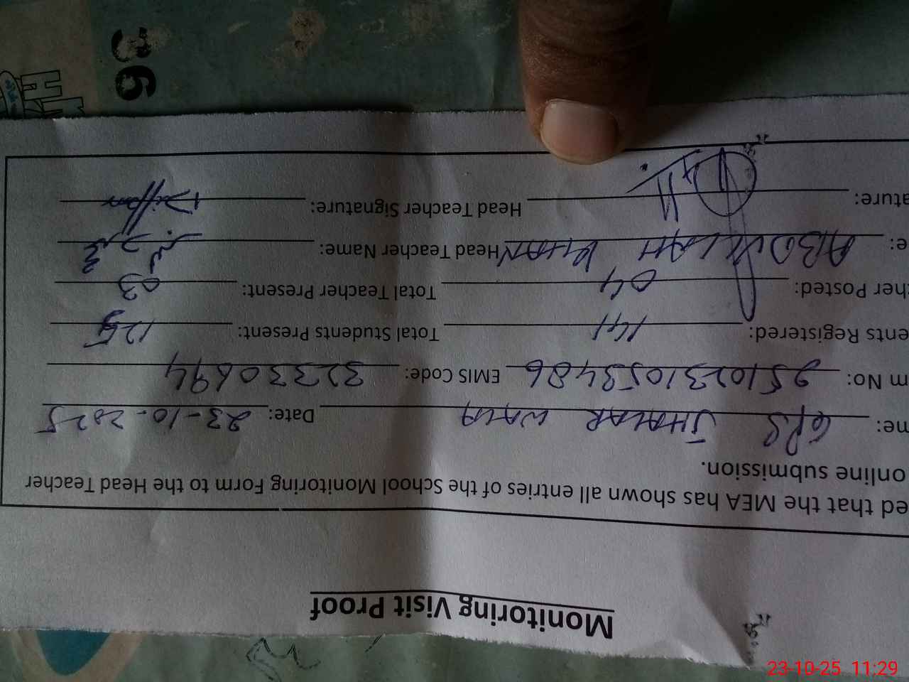 | Attendance Register | Head Teacher | MEA with School | Visit Proof |