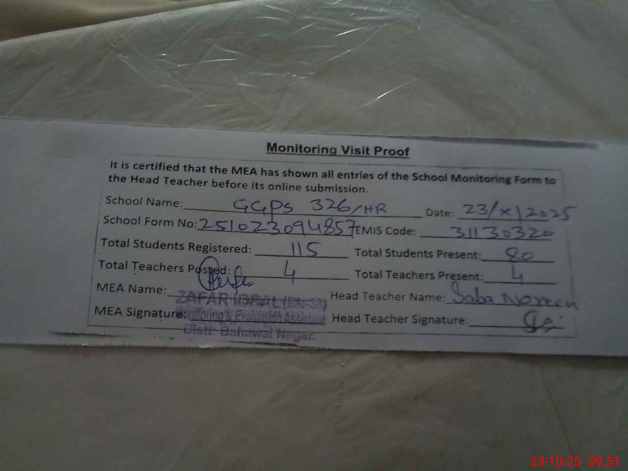 | Monitoring Date: 23-10-2025 | Start Time: 23-10-2025 09:40 AM | End Time: 23-10-2025 09:51 AM | Name of MEA: Za**** Iq**** BN**** | |