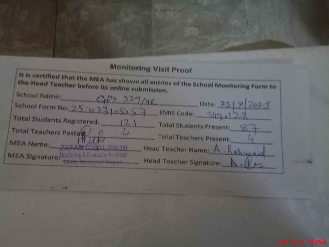 | Monitoring Date: 23-10-2025 | Start Time: 23-10-2025 10:37 AM | End Time: 23-10-2025 10:53 AM | Name of MEA: Za**** Iq**** BN**** | |