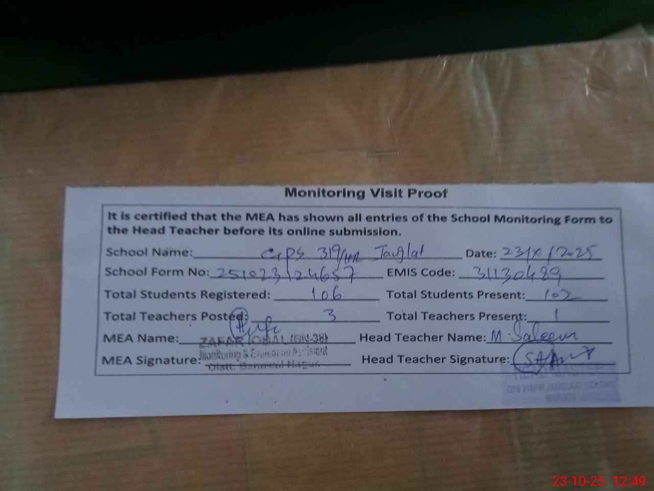 | Attendance Register | Head Teacher | MEA with School | Visit Proof |