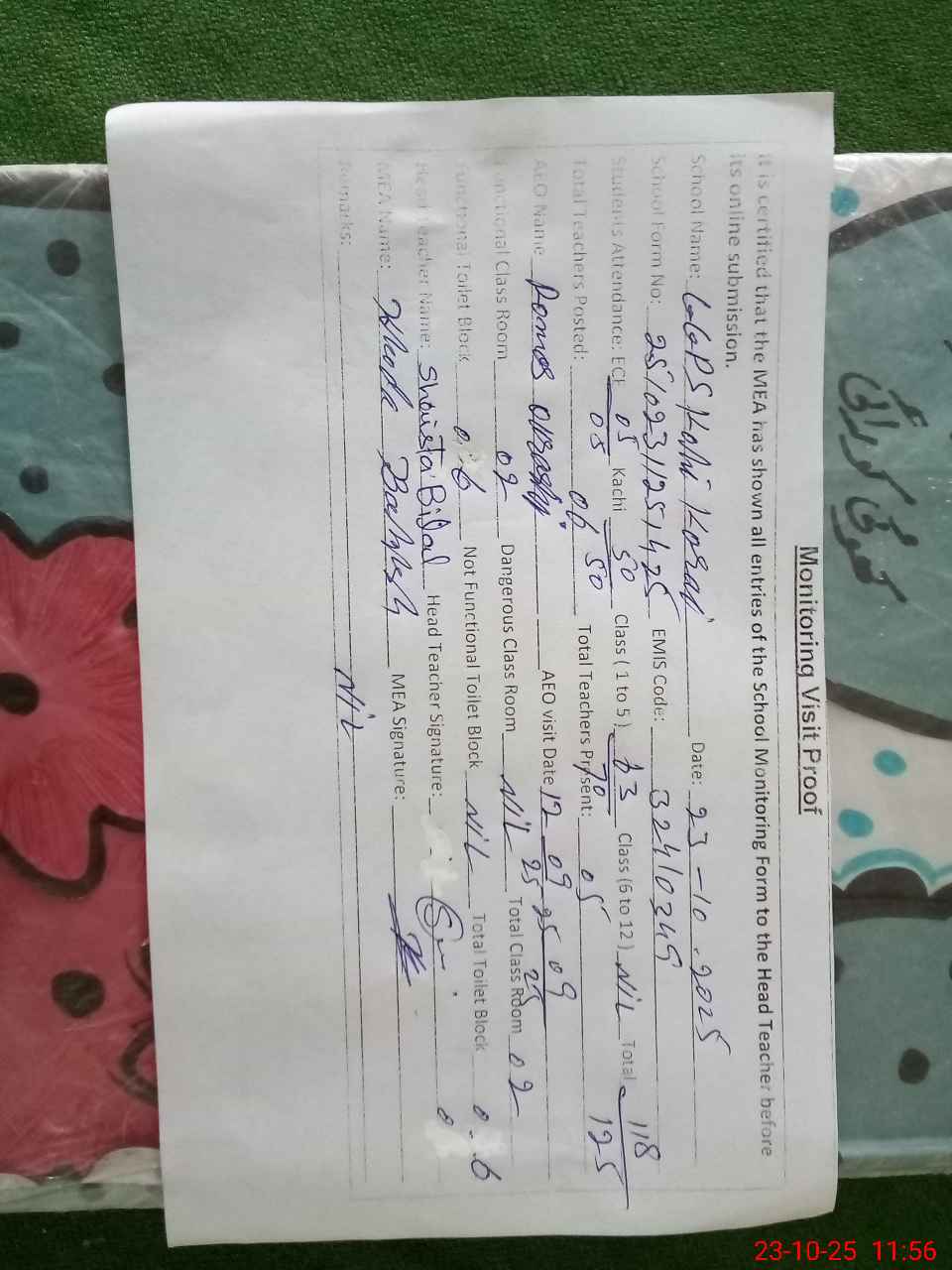 | Attendance Register | Head Teacher | MEA with School | Visit Proof |