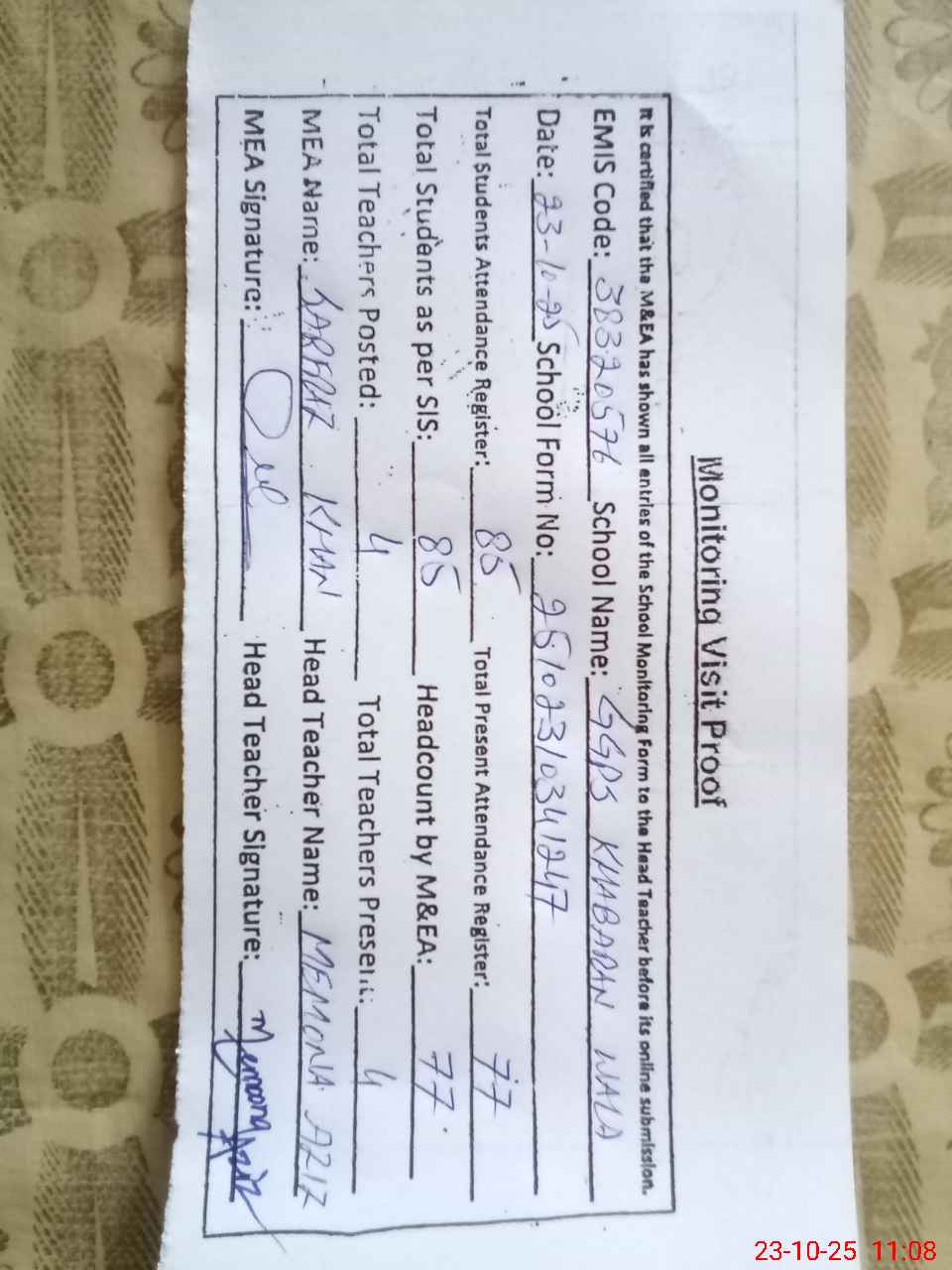 | Attendance Register | Head Teacher | MEA with School | Visit Proof |