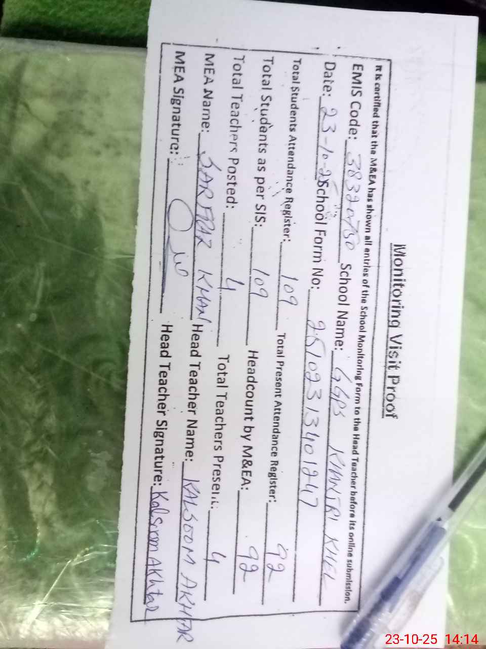 | Attendance Register | Head Teacher | MEA with School | Visit Proof |