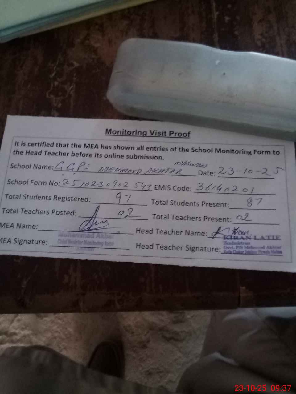 | Attendance Register | Head Teacher | MEA with School | Visit Proof |