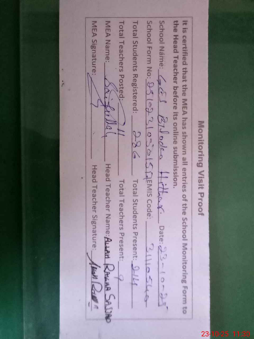 | Attendance Register | Head Teacher | MEA with School | Visit Proof |
