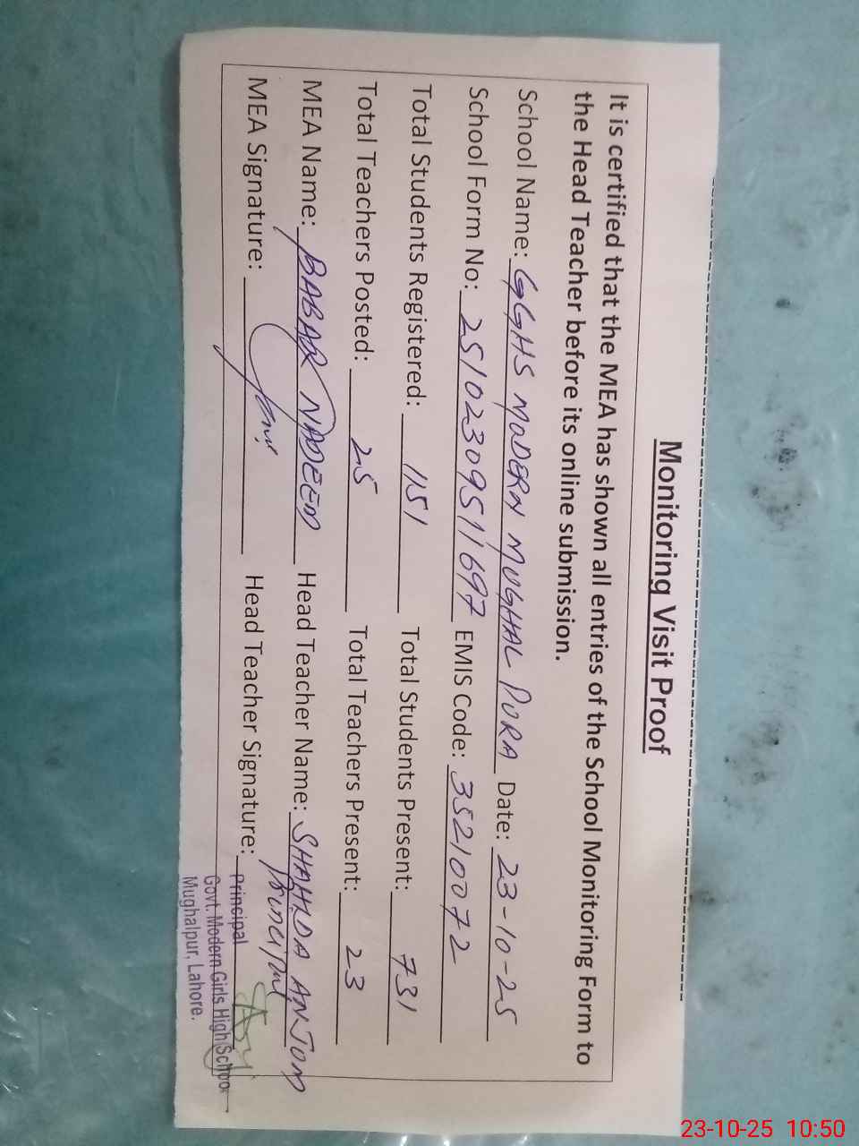 | EMIS Code: 35210072 | Name of School: GGHS MODERN MUGHALPURA, SHALIMAR LINK ROAD | |||