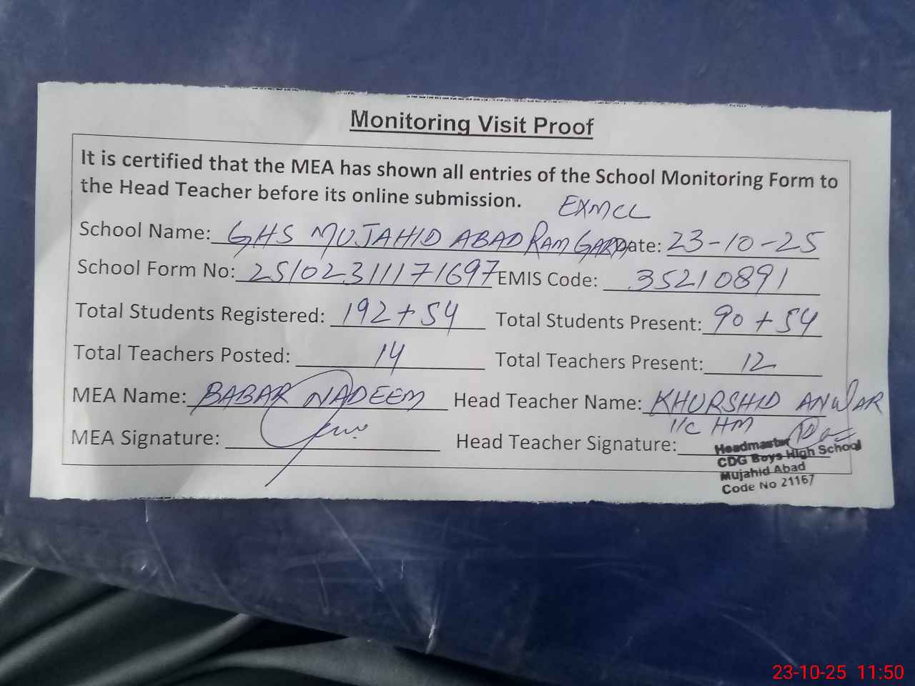 | EMIS Code: 35210891 | Name of School: GHS MUJAHID ABAD RAM GHAR (EX-MCL) | |||