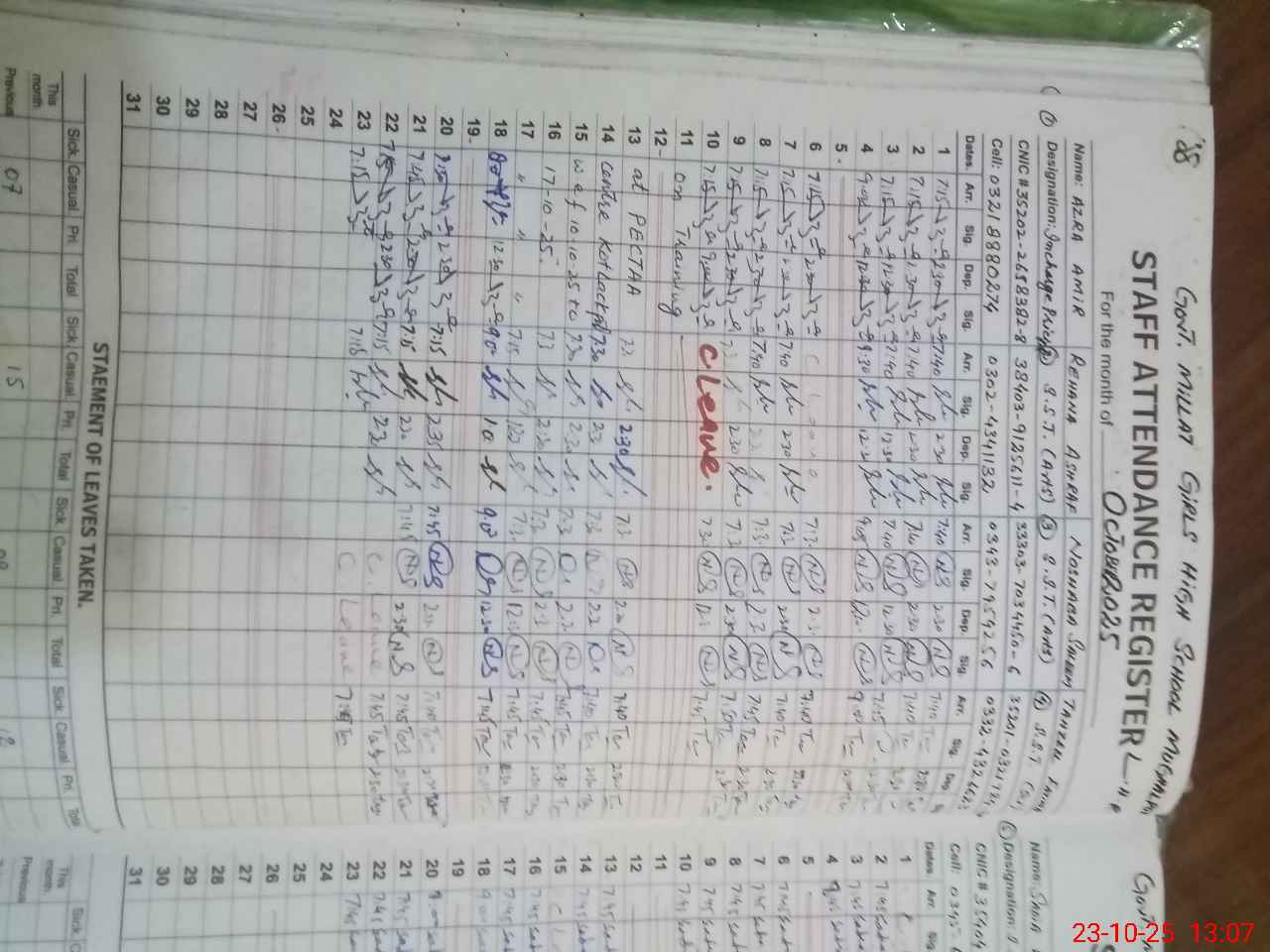 | Remarks (Use Separate Page if Required): Teacher Aisha Riaz EST absent from duty since 01 September 2025 to till date | |||||