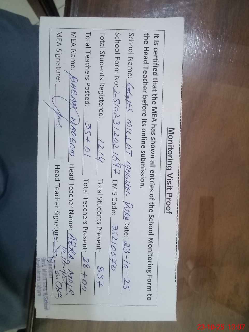 | EMIS Code: 35210070 | Name of School: GGHS MILLAT MUGHAL PURA LAHORE | |||