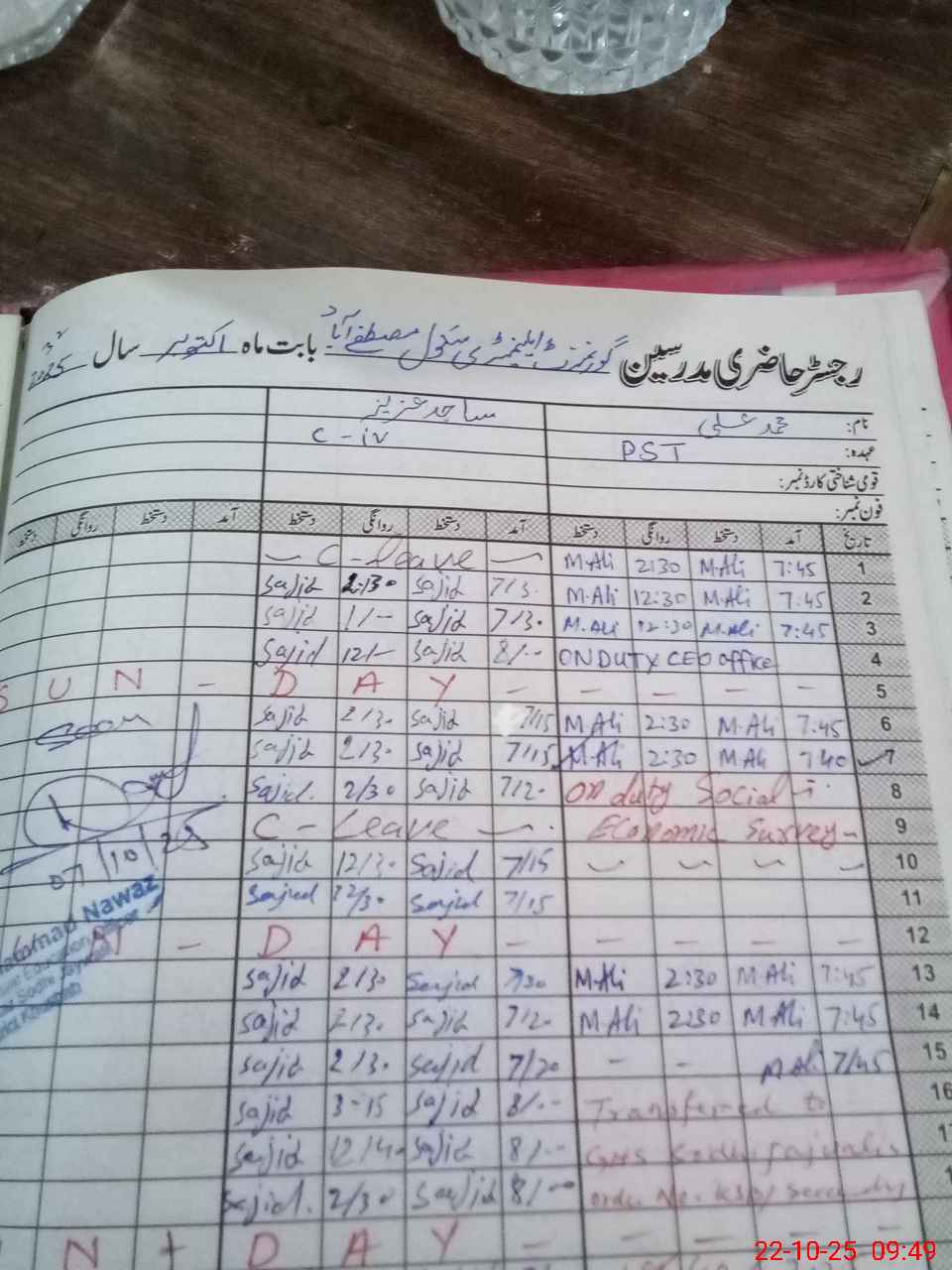 | CNIC | Full Name | Designation | R/C | Absence During Last Calender Month |